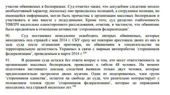 Относительно расследования трагедии в Одессе 2 мая 2014 года, когда в стычках на улицах города и при пожаре в Доме профсоюзов погибли 48 человек, миссия ООН констатировала, что на сегодняшний день никто не привлечен к ответственности ни за акты насилия в тот день, ни за гибель кого-либо из 48 человек, ставшей их результатом.