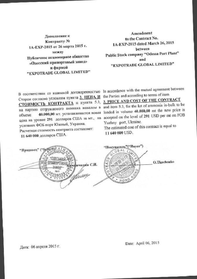 Тогда же выяснилось, что буквально за месяц до подписания договора Dreymoor Fertilizers с белизской Expotrade Global (в марте 2015 года) Одесский припортовой завод подписал с одноименной компанией Expotrade Global (но уже с регистрацией в Гонконге) два договора на поставку 60 тыс. тонн карбамида и 40 тыс. тонн аммиака.