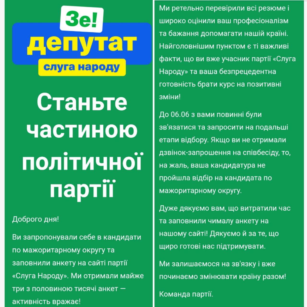 "Вы предложили себя в кандидаты по мажоритарному округу и заполнили анкету на сайте партии "Слуга народа". Мы получили почти три с половиной тысячи анкет - активность поражает!