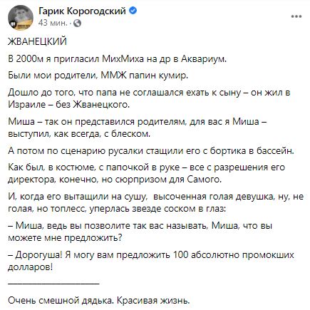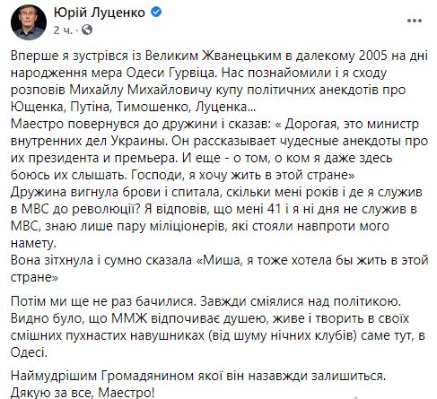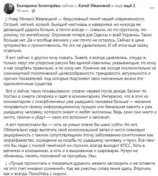 "Умер Михаил Жванецкий — безусловный гений нашей современности. Острый, меткий, колкий, бьющий наотмашь и наверняка, но никогда не делающий ударом больно, а почти всегда — смешно, но по-грустному, по-умному, по-житейскому. Огромная потеря для Одессы и всей Украины. Таких больше нет. Да и вообще великих у нас почти не осталось. Сейчас в цене хуторянство и примитивность. Но это не удивительно. И об этом ещё скажу отдельно.
