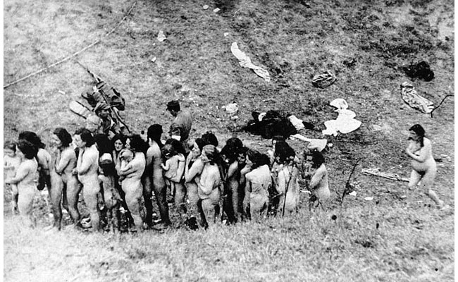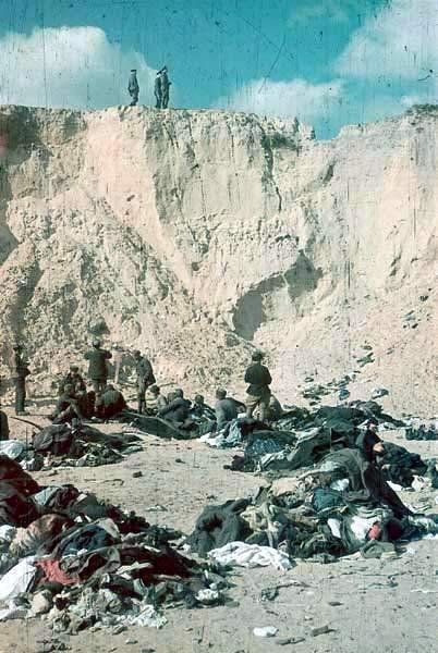 Из свидетельских показаний шофера Вермахта: "Раздетых евреев направляли в овраг примерно 150 метров длиной, 30 метров шириной и целых 15 метров глубиной. В этот овраг вело 2 или 3 узких прохода, по которым спускались евреи. Когда они подходили к краю оврага, немецкие полицейские хватали их и укладывали на трупы уже находившихся там расстрелянных евреев. Это происходило очень быстро. Трупы лежали аккуратными рядами. Как только еврей ложился, подходил полицейский с автоматом и стрелял лежавшему в затылок. Евреи, спускавшиеся в овраг, были настолько испуганы этой страшной картиной, что становились совершенно безвольными. Из города прибывали все новые массы людей и они, по-видимому, ничего не подозревали, полагая, что их просто переселяют".