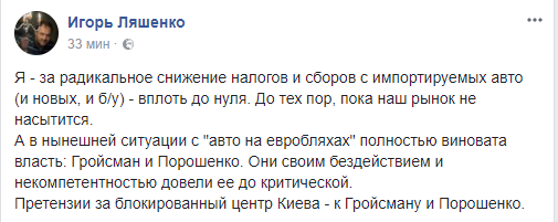 "Я - за радикальное снижение налогов и сборов с импортируемых авто (и новых, и б/у) - вплоть до нуля. До тех пор, пока наш рынок не насытится. А в нынешней ситуации с "авто на евробляхах" полностью виновата власть: Гройсман и Порошенко. Они своим бездействием и некомпетентностью довели ее до критической. Претензии за блокированный центр Киева - к Гройсману и Порошенко".