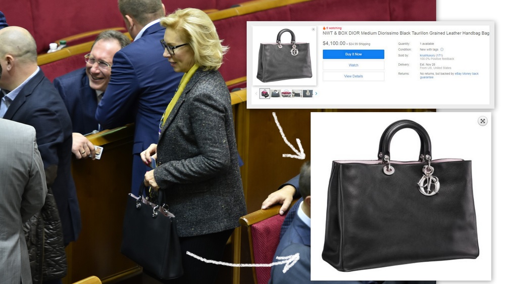Модель сумки под названием Diorissimo от дома мод Dior (похожая есть у жены генерального прокурора Ирины Луценко), впервые выпущена в свет в 2012 году. За основу взяли знаменитую сумочку Lady Dior, но увеличили в размере и выполнили из мягкой кожи.