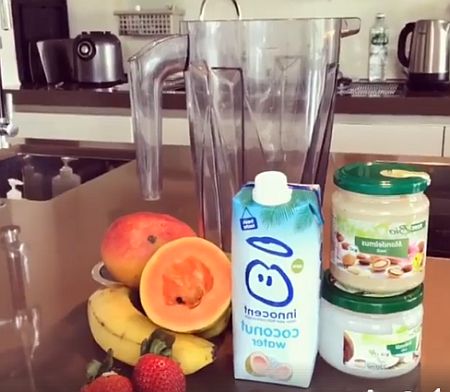 Согласно рецепту Натальи Кличко, для стройнящего смузи нужна клубника, папайя, банан, кокосовое молоко и миндальное масло.