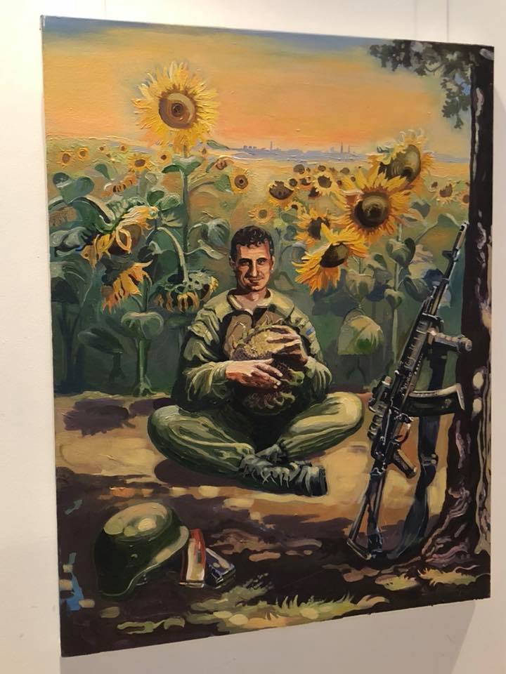 "Все висящие здесь картины нарисованы за последние несколько лет. Я начала рисовать в годовщину смерти своего мужа. Я искала счастья. Первая картина, которую я нарисовала, называется "Иловайск". Она состоит из двух частей  - взрыв и поле с подсолнухами. Мне захотелось нарисовать то, что он видел в последний раз. Казалось бы, где тут счастье? Но в этом моя интуиция - когда я добралась до мирной части кратины, я вспоминала реальные ситуации из жизни, и они были без потерь. Я поняла, что когда я выкладываю на полотно вещи и символы, которые были в моей жизни, я переживаю радость. Мой муж любил подсолнухи. И говорил, что когда им (воинам, - ред.) хотелось есть, они ели семена подсолнуха. И погиб он на поле подсолнуха. И когда я рисую подсолнухи, он всегда рядом. А когда я пришла на его могилу через год, там сам по себе тоже вырос подсолнух - как раз напротив его портрета высоко. Я поднялась на носочки и поцеловала его. Когда я это пишу, то переживаю счастливые чувства", - цитирует нардепа Цензор.НЕТ.