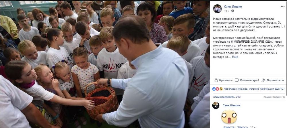 Сейчас 45-летний Ляшко проводит бурную деятельность, ездит по регионам, работает с избирателями и всячески отчитывается об этом в социальных сетях. Так, на днях он выложил у себя на странице в соцсети Facebook снимок из Сновской детско-юношеской спортивной школы, что на Черниговщине. В подписи Олег Валерьевич отчитывается, что "мы (Радикальная партия. – Прим. ред.) помогли отремонтировать здание, раздевалки и установить новую спортивную площадку".