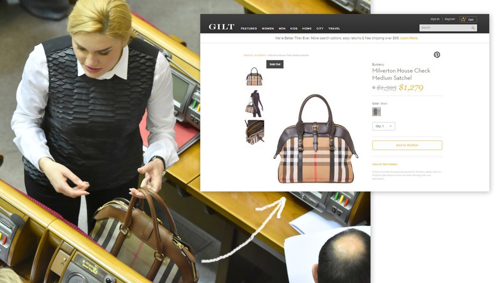 Кстати, Ляшко не единственный депутат, у которого есть вещи Burberry. Однажды в парламенте фотокорреспонденты "Страны" видели нардепа Татьяну Острикову ("Самопомощь") с сумкой этого бренда.