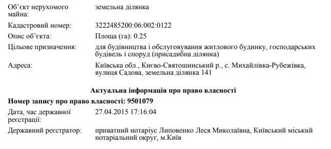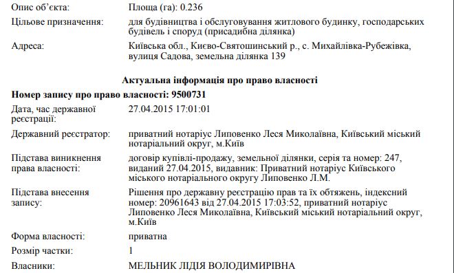 Как следует из документа, сделка состоялась в апреле 2015 года. С тех пор Лидия Владимировна является собственницей половины гектара земли в Киевской области. На сайтах по продаже недвижимости стоимость сотки в Михайловке-Рубежовке стартует от $4000.