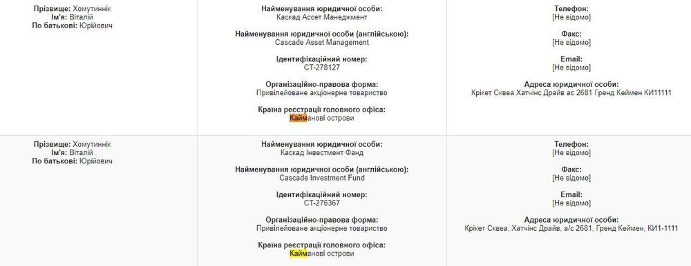 Зарегистрирована яхта на на Каймановых островах, а в декларации за 2017 год Хомутынника указано две компании тут, собственником которых он является.