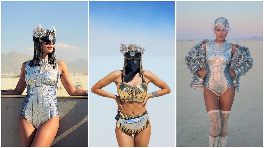 Пустыню превращают в фантастический мир. Те, кто приехал на фест, обязательно должен быть в каком-то невероятном костюме. Лещенко и Топольская успели переодеться несколько раз и продемонстрировать тематические наряды, которые создали мастера из украинской Patoka Studio. Маски с перьями изготовила Леся Патока, а парики с кристаллами - дизайнер Иван Фролов, который одевал певицу Джамалу на "Евровидение".