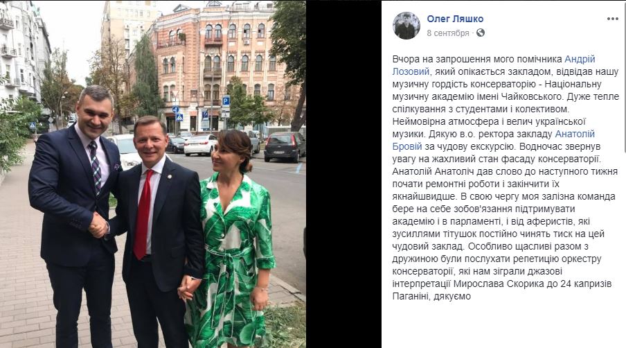 На днях Олег Ляшко, лидер "Радикальной партии" написал у себя на странице в социальной сети Facebook очередной пост о том, как он улучшает мир вокруг себя и решает проблемы разного характера. На сей раз политик вместе с супругой (по приглашению своего помощника Андрея Лозового) посетил Национальную музыкальную академию им. Чайковского и обратил внимание на ужасное состояние фасада здания.