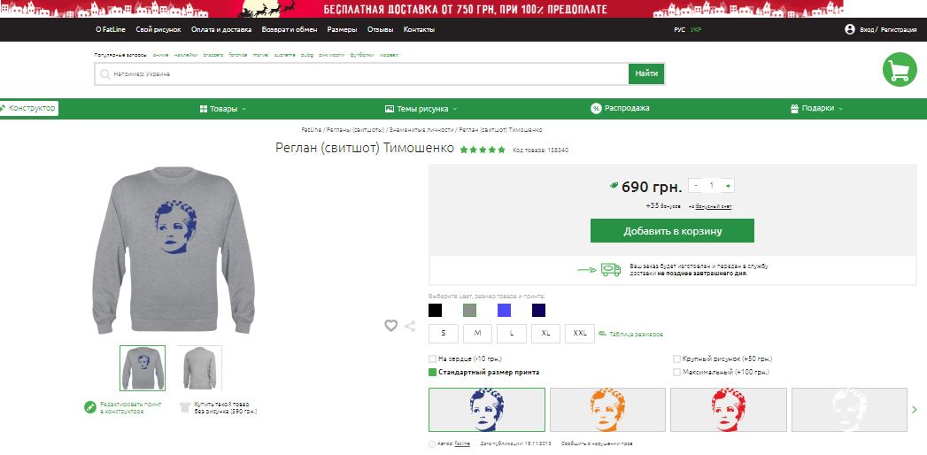 Украинских политиков "Страна" отыскала на отечественных сайтах. К примеру, свитшот с Юлией Тимошенко можно заказать за 690 гривен. Есть различные цвета, а также можно выбрать цвет самого портрета.