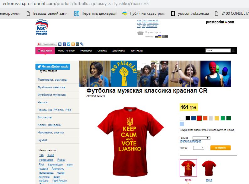Нашлась так же футболка с лидером "Радикальной партии". А точнее с надписью: "Сохраняйте спокойствие и голосуйте за Ляшко". Стоит она 461 гривну.