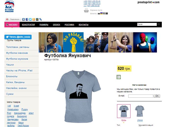 А для тех, у кого ностальгия по прошлому, можно заказать футболку с портретом беглого президента Виктора Януковича с улыбкой на лице. На данный момент вещи нет в наличии, но под заказ вам ее обязательно изготовят. Правда, Янукович стоит дороже, чем Ляшко, а точнее - 520 гривен.