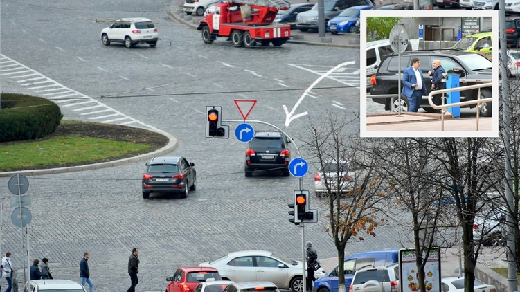 На выезде с парковки, а конкретно с улицы Трехсвятительской на Европейскую площадь - кортеж Гройсмана нарушил правила дорожного движения: он проигнорировал знак 4.2 "Движение направо", согласно которому, автомобили могут двигаться только в этом направлении.