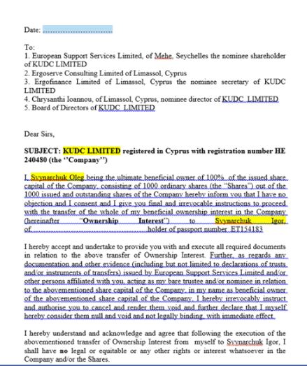 Документ о передаче Игорю Свинарчуку от Олега Свинарчука акций нескольких кипрских компаний KUDC LIMITED и AUTORETAIL LIMITED фото: dubinsky.pro