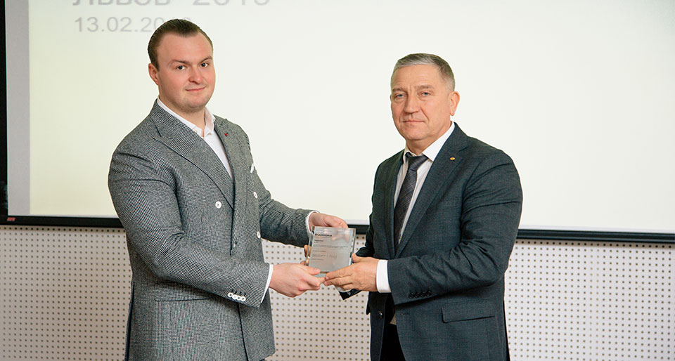 Игорь Гладковский награждает одного из автодилеров на церемонии подведения итогов в "Хюндай Мотор Украина", фото: hyundai.com.ua