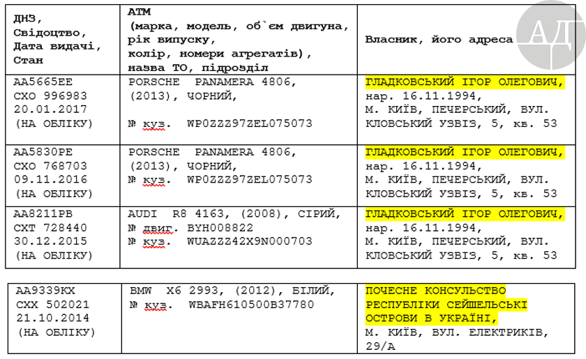 Александр Дубинский также утверждает, что с 2014 года Игорь имеет два паспорта с разными фамилиями. На фамилии Гладковский он живет, а на фамилии Свинарчук - владеет офшорной империей отца. На имя Гладковского-младшего зарегистрировано три спортивных автомобиля: два Porsche Panamera и один AUDI R8.