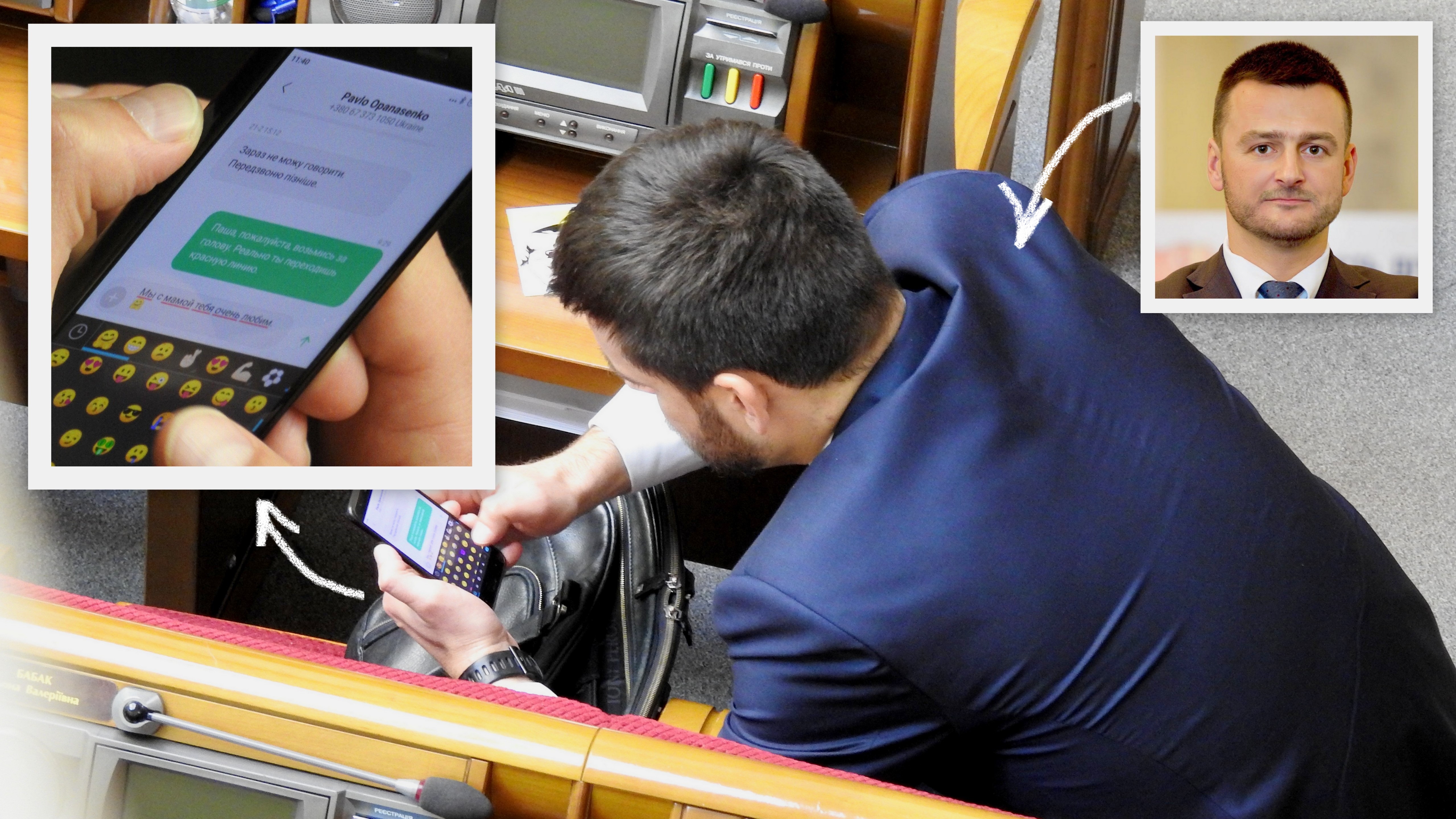 Еще один депутат из "Самопомощи" на рабочем месте решает свои семейные проблемы. Отец четверых детей 41-летний Александр Опанасенко, который по слухам скоро выйдет из партии, в парламенте переписывается со своим сыном Павлом. Текст удалось увидеть фотокорреспондентам "Страны".