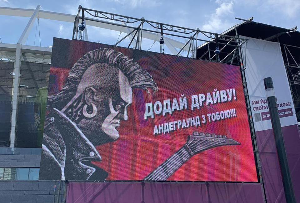 Плакат на сцене перед НСК "Олимпийский", где состоялись дебаты между Порошенко и Зеленским, фото: "Страна"