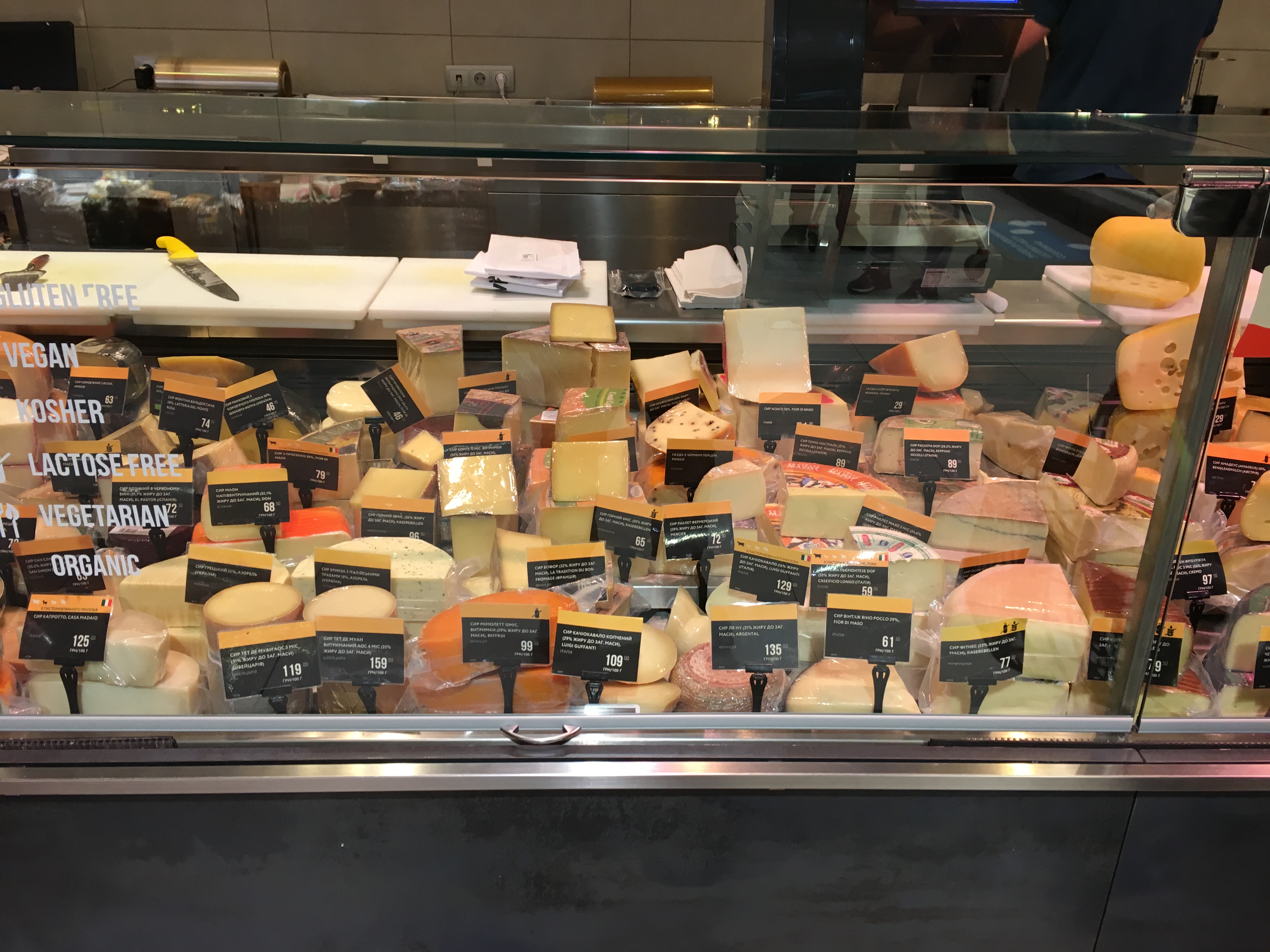Здесь нельзя купить килограмм сыра за 58 гривен. От 56 до 335 грн – это ценник за 100 грамм. К примеру 100 грамм выдержанного овечьего сыра El Pastor Castellano (Испания) стоит 59 гривен, а итальянская буратта Luigi Buffanti (итальянский свежий сыр, изготавливаемый из сливок и молока буйволицы) продается по цене 129 гривен/100 гр.