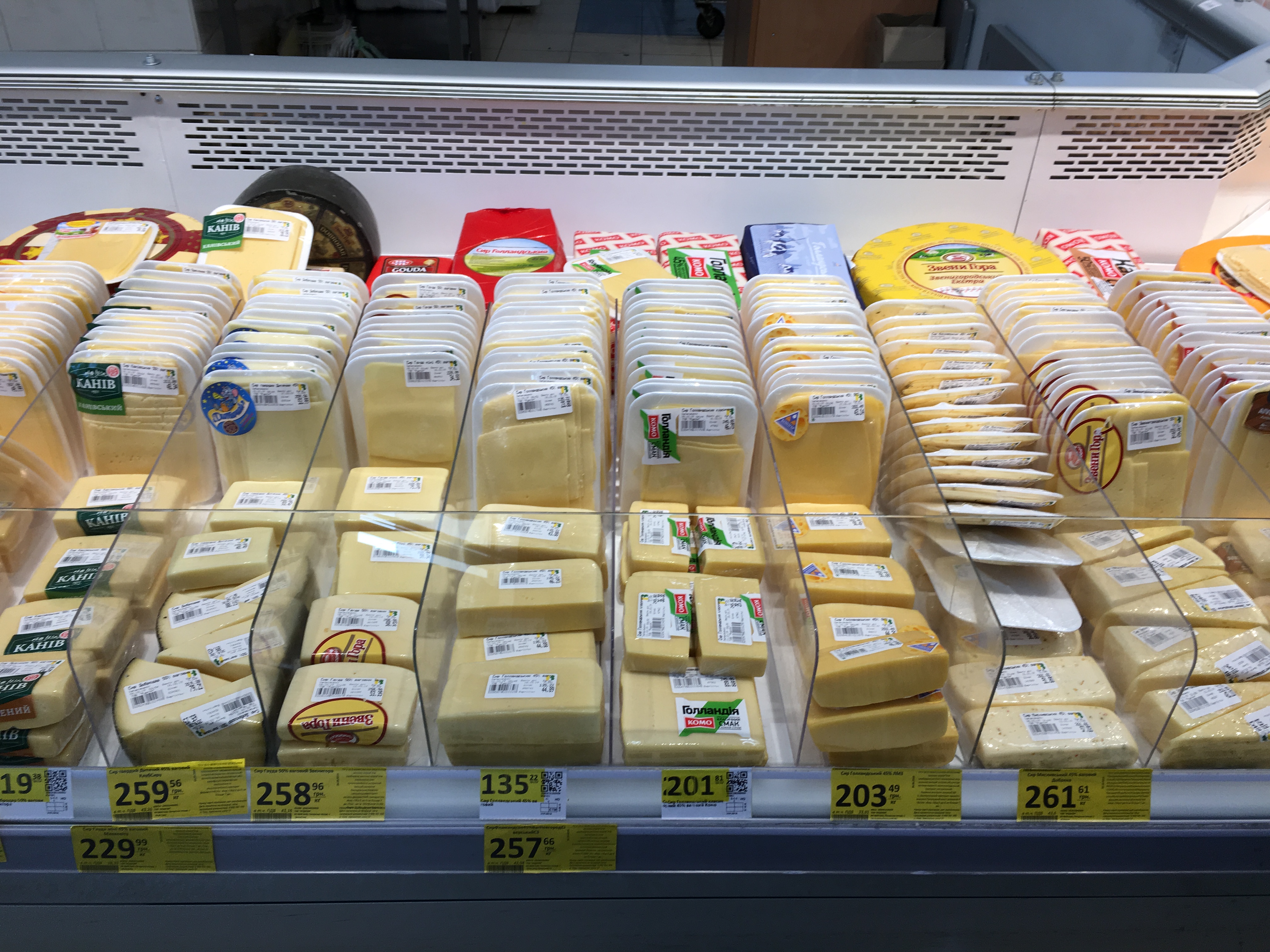 Также в супермаркете мы посмотрели цены на среднестатистические сыры. Килограмм хорошего твердого сыра обойдется около 250 гривен.