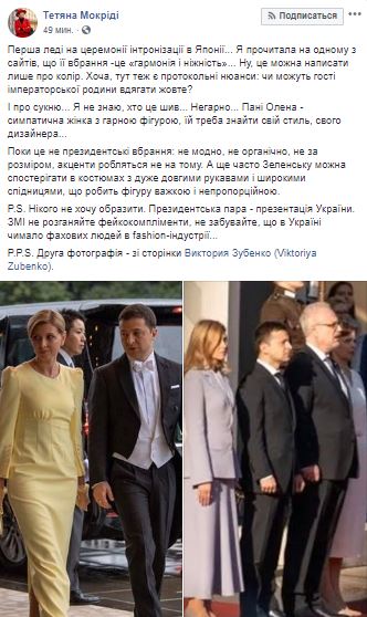 "Первая леди на церемонии интронизации в Японии ... Я прочитала на одном из сайтов, что ее наряд – это "гармония и нежность"... Ну, это можно написать только о цвете. Хотя здесь тоже есть протокольные нюансы: могут гости императорской семьи надевать желтое? И о платье... Я не знаю, кто это шил... Некрасиво... Госпожа Елена – симпатичная женщина с хорошей фигурой, ей надо найти свой стиль, своего дизайнера... Пока это не президентские наряды: не модно, не по размеру, акценты делаются не на том. А еще часто Зеленскую можно наблюдать в костюмах с очень длинными рукавами и широкими юбками, что делает фигуру тяжелой и непропорциональной. P.S. Никого не хочу обидеть. Президентская чета – презентация Украины. СМИ не разгоняйте фейкокомплименты, не забывайте, что в Украине немало профессиональных людей в fashion-индустрии", – размышляет Мокриди.