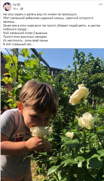 "Не могу сидеть и делать вид,что ничего не произошло... Убит маленький ребеночек, чудесный малыш... крестной которого я являюсь... Зачем все в этом мире,если так просто убивают людей, деток... в центре любимого города... Мой маленький Ангел, Сашенька. Прости этим взрослым нелюдям их жестокость... силы всей семье. В этот страшный час...", - написала Билык у себя на странице в социальной сети Facebook.