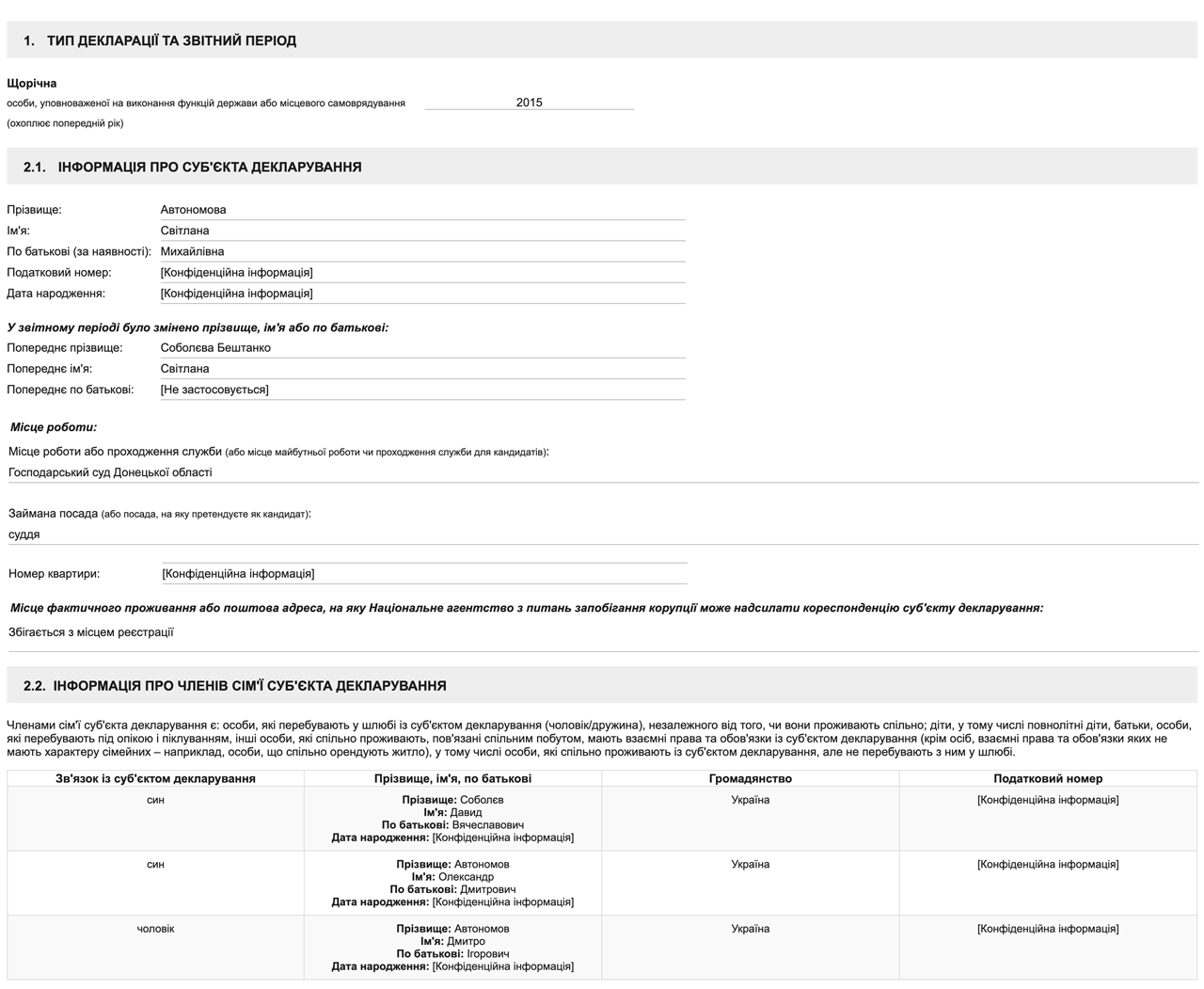 Среди тех жен, которые фигурируют в официальной биографии депутата, матери Давида мы не нашли. Но, скорее всего его родила Светлана Автономова, судья Хозяйственного суда Донецкой области. В ее декларации на официальном сайте НАПК (Национальное агентство по вопросам предотвращения коррупции) за 2015 год есть сын Давид Вячеславович Соболев (2006 года рождения) и предыдущая фамилия - Соболева, а в девичестве - Бештанко.