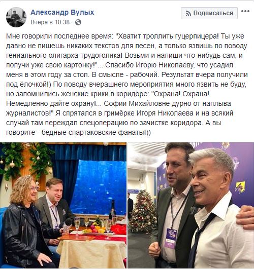 "По поводу вчерашнего мероприятия много язвить не буду, но запомнились женские крики в коридоре: "Охрана! Охрана! Немедленно дайте охрану!... Софии Михайловне дурно от наплыва журналистов!" Я спрятался в гримерке Игоря Николаева и на всякий случай там переждал спецоперацию по зачистке коридора", – написал он на своей странице в социальной сети Facebook.