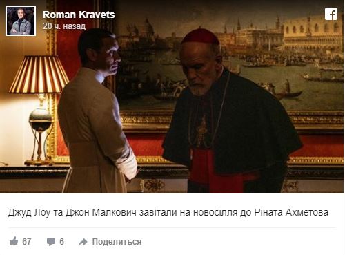 "Джуд Лоу и Джон Малович на новоселье у Рината Ахметова", - написал пользователь Роман Кравец, скорее всего с отсылкой на сериал "Новый папа".