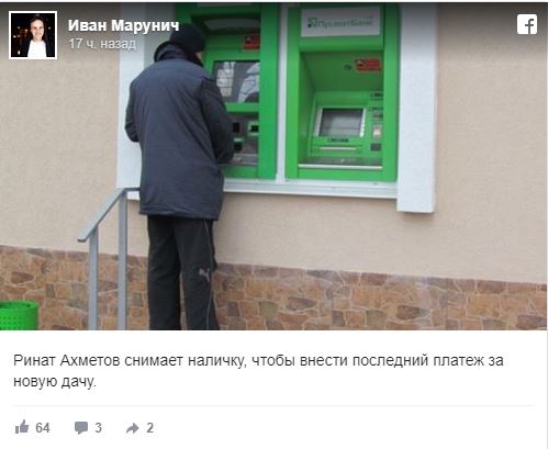 "Ринат Ахметов снимает наличку, чтобы внести последний платеж за новую дачу", - пошутил музыкант и блогер Иван Марунич.