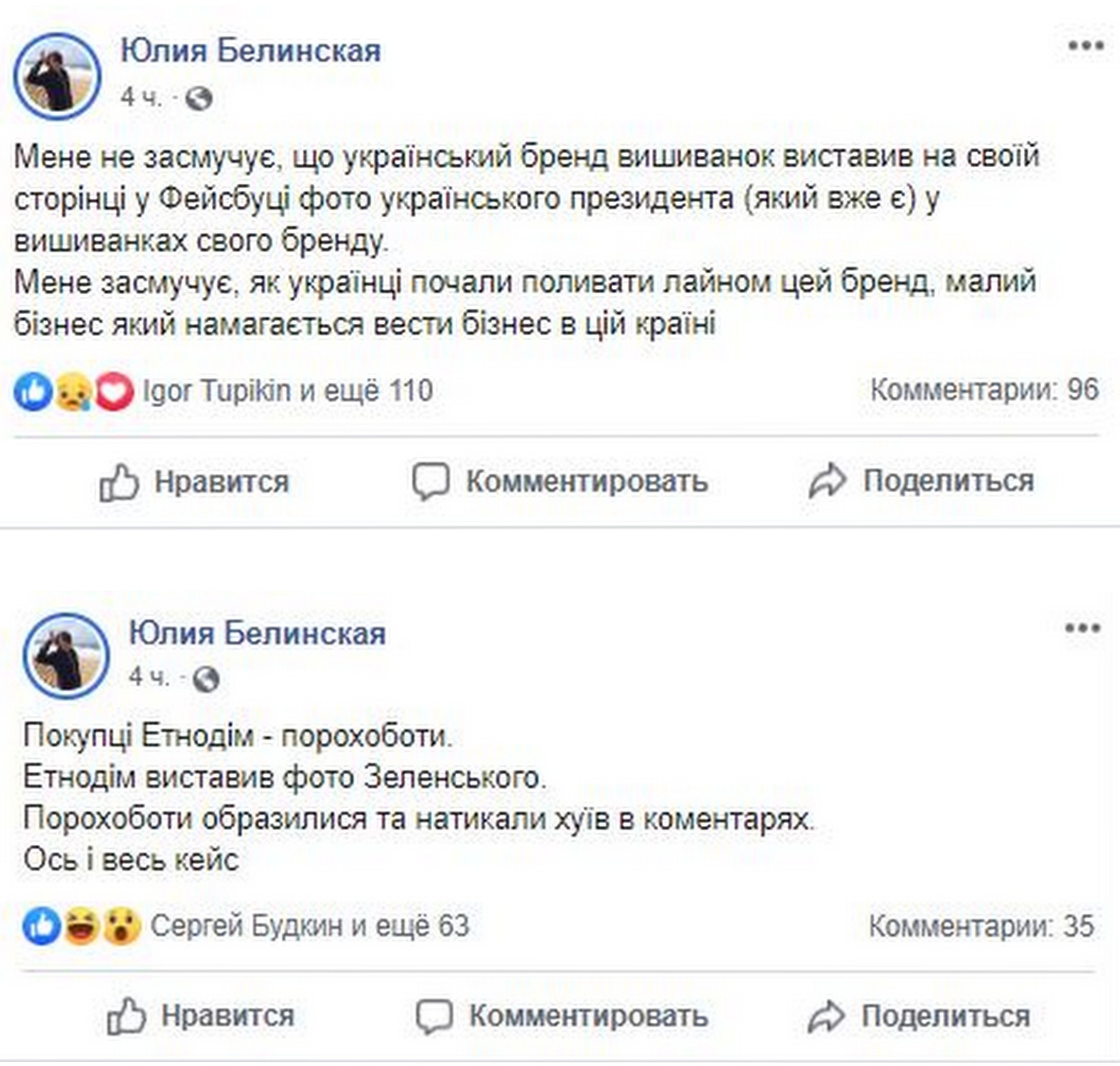 "Меня не огорчает, что украинский бренд вышиванок выставил на своей странице в "Фейсбуке" фото украинского президента (который уже есть) в вышиванках своего бренда. Меня огорчает, как украинцы начали поливать дерьмом этот бренд, малый бизнес, который пытается вести бизнес в этой стране", - написала Юлия Белинская, издатель и главный редактор отраслевого портала Retailers.ua.