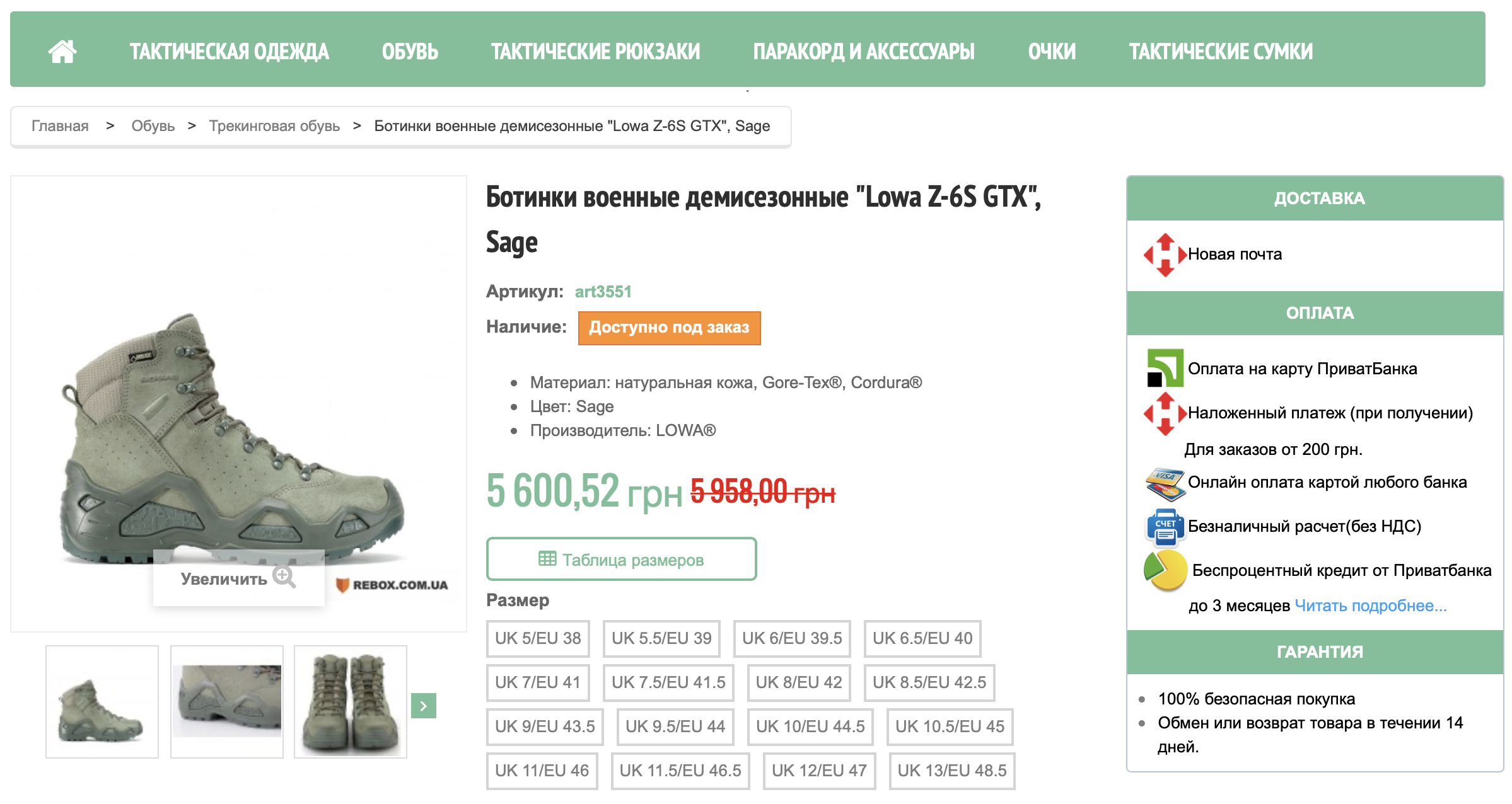 Данная модель военных ботинок снабжена мембраной Gore-Tex, которая защищает ногу от внешней влаги и хорошо отводит испарения. Обувь из натуральной кожи и стоит со скидкой 5 600 гривен.
