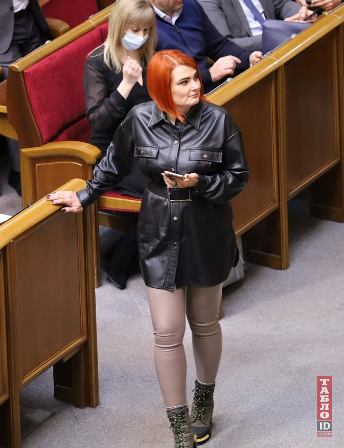 35-летняя Людмила Буймистер пришла на работу в парламент в черном кожаном платье-рубашке с поясом и в бежевых леггинсах.