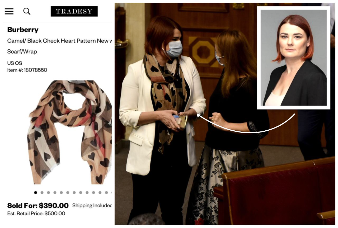Кстати, несмотря на то, что депутат говорит о любви к масс-маркету, фотокорреспонденты "Страны" как-то видели Буймистер в культовом клетчатом шарфе прославленной британской марки Burberry за $390. При этом на сайте отмечается, что его изначальная цена была $500. А это около 14 000 грн по курсу НБУ на 01.03.2021 года.