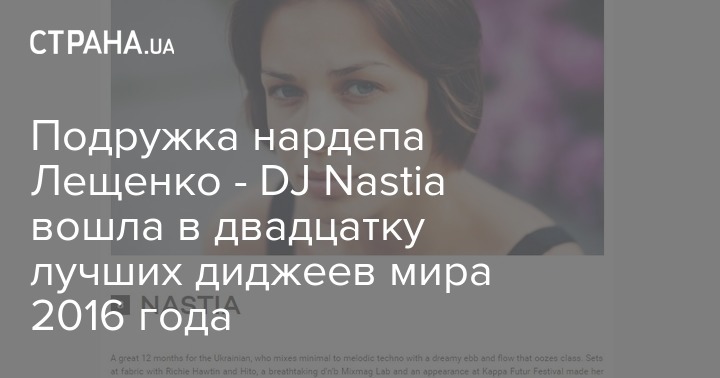 Британский журнал MixMag, который специализируется на клубной и танцевальной музыке, подвел итоги уходящего года. Они опубликовали топ-20 лучших диджеев 2016 года. DJ Nastia (Анастасия Топольская), девушка народного депутата Сергея Лещенко заняла в рейтинге 8-е место.