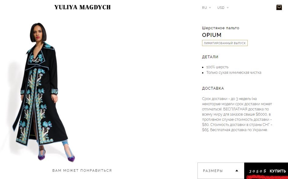 Модель платья-пальто нардепа Ионовой из лимитированной серии называется "Опиум" и стоит $3050 или 78 995 грн по курсу НБУ на 05.09.2017 г. Выполнено из 100% шерсти.