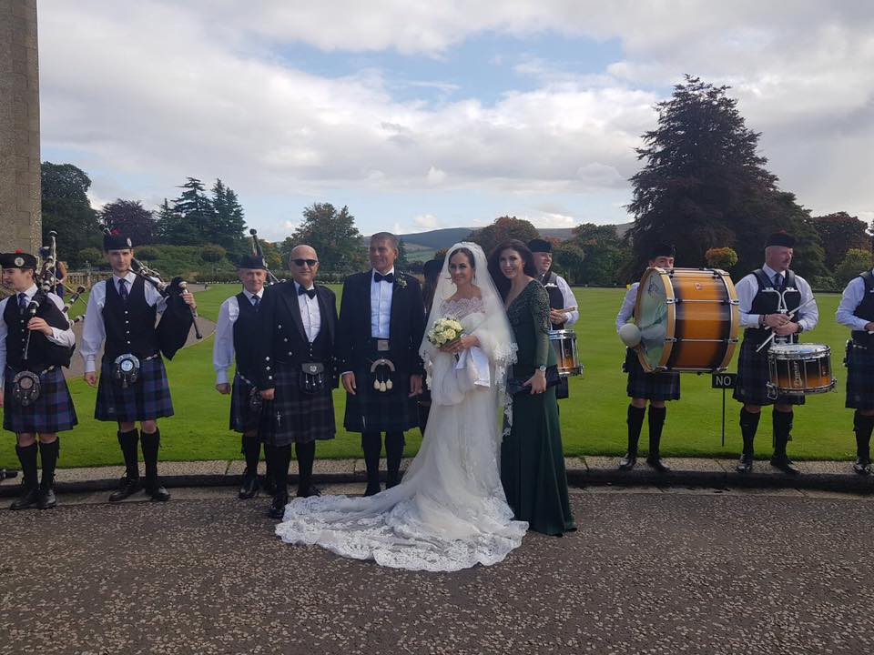 А вот жених и его друзья были в килтах (предмет мужской шотландской национальной одежды в виде юбки и сумочки для мелких вещей).