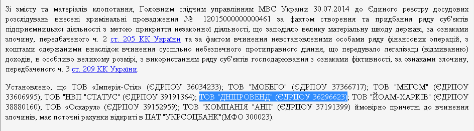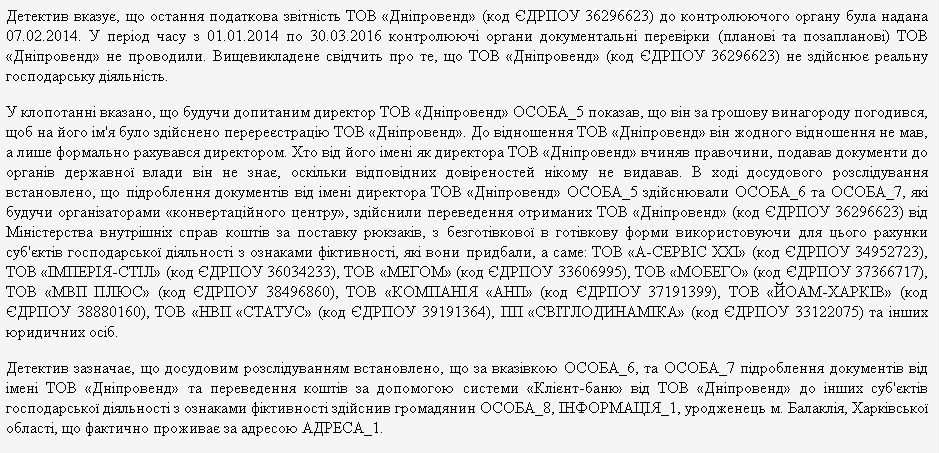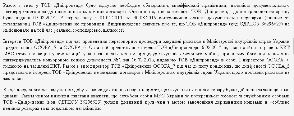 После открытия прокуратурой уголовного производства по закупке рюкзаков, МВД в июле 2015 года открыло еще одно производство, согласно которому ООО "Днипровенд" участвовало в конвертационном центре.