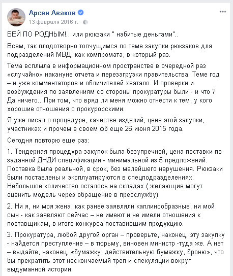 Министр внутренних дел Арсен Аваков ожидаемо опроверг все обвинения против него и сына. В феврале 2016 года в своем Facebook он заявил, что поставка рюкзаков была реальной, а он и его семья не имеют отношения к закупке: