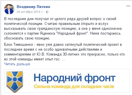 Также Владимир Литвин, непосредственно перед выборами в Раду 24 октября 2014 года, продвигал в своем Facebook партию "Народный фронт":