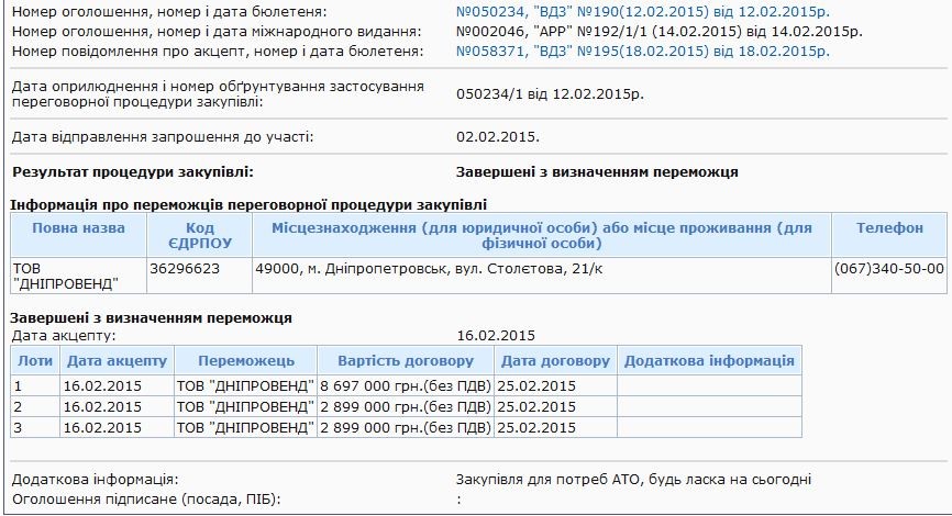 В обосновании применения переговорной процедуры с небольшим числом участников вместо открытого тендера МВД сослалось на срочную необходимость закупки для материально-технического обеспечения личного состава министерства, задействованного в зоне АТО.
