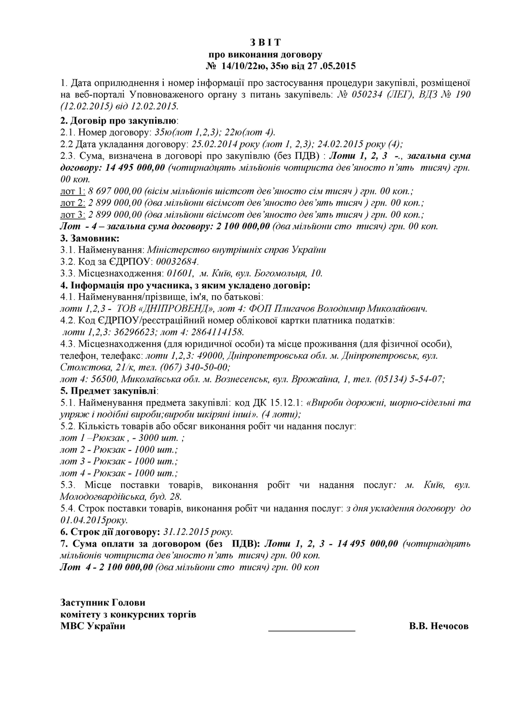 Но в ходе переговоров цена выросла. В итоге МВД закупило рюкзаков на 16,60 млн грн. Основным поставщиком на сумму 14,5 млн грн стало ООО "Днипровенд" из Днепропетровска: