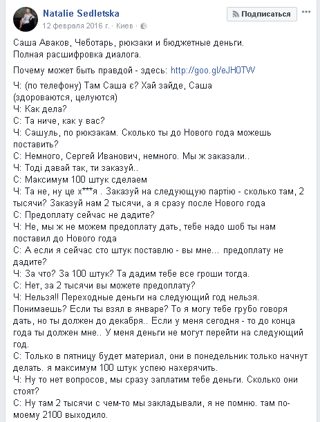 Расшифровка беседы "Авакова-младшего" и "Чеботаря" была обнародована руководителем телепрограммы "Схемы" Натальей Седлецкой: