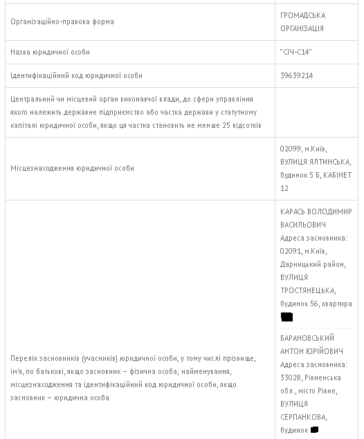 На самом деле, согласно данным реестра юридических лиц, организация была зарегистрирована не 14 октября, а 13 февраля 2015 года. А полное название организации "Сич - С14". То есть слово "Січ" в названии указано отдельно от традиционного символа ультраправых "С14".