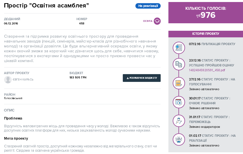 Расчет бюджета проекта "Простір "Освітня асамблея", источник: gb.kyivcity.gov.ua
