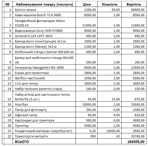 За эти деньги "Освітня асамблея" обзавелась необходимым комплектом для проведения массовых мероприятий - генератором, кофемашиной, ноутбуками, фото-и видеокамерами и т.д. Наибольшие расходы в проекте - покупка 50 кресел-мешков за 60 тыс. и транспортные расходы на 35,7 тыс. грн. За счет столичного бюджета были приобретены даже офисная бумага и мячи с ракетками для настольного тенниса: