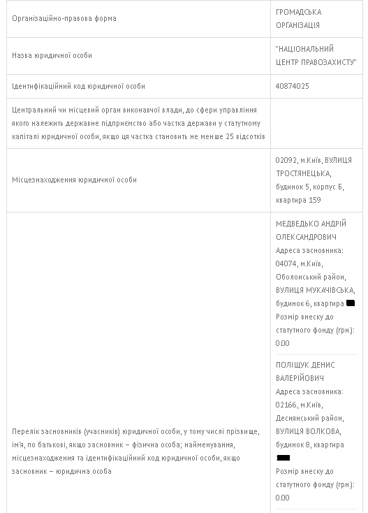 Оба обвиняемых в убийстве Олеся Бузины Медведько и Полищук являются соучредителями общественной организации "Национальный центр правозащиты".