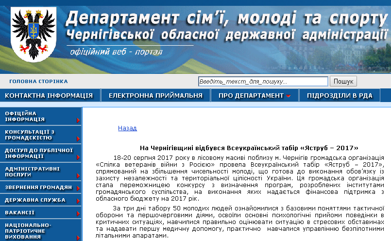Эта организация вместе департаментом семьи, молодежи и спорта Черниговской обладминистрации в августе этого года провела военно-патриотические сборы "Ястреб - 2017". Об этом сообщается на сайте департамента: